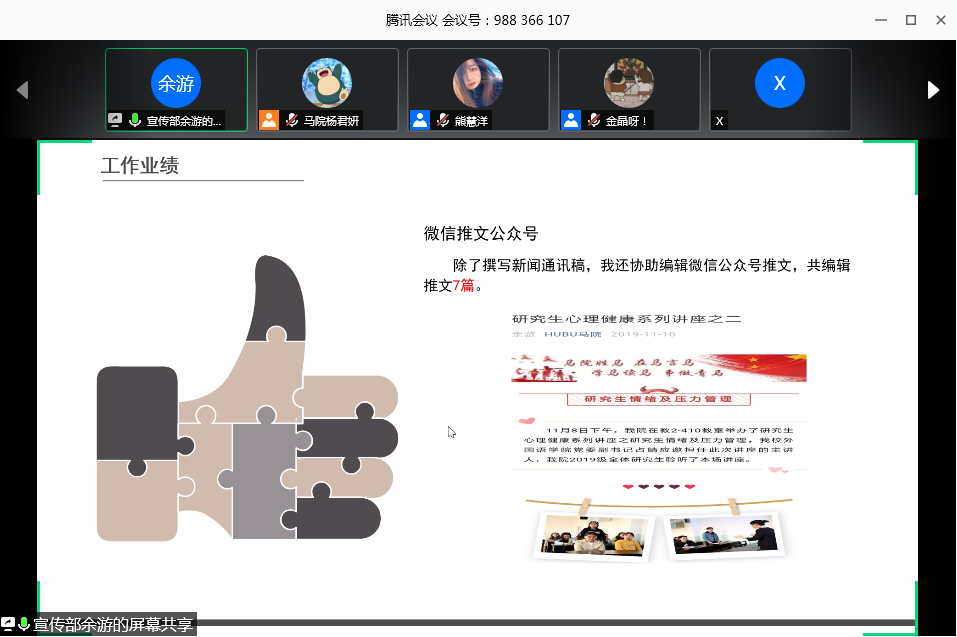 会议第二项议程,由王璐璐、史健桥、李菀、熊罗美婧、李睿、余游、杨瑶和林婉8名同学依次进行个人工作汇报。各汇报人分别从工作态度、工作能力、工作内容和工作业绩四个方面总结自己2019年度研究生会的工作情况。其中,办公室主任王璐璐展示了研会百度云盘文件收录情况、活动及会议考勤记录情况,做好研会工作的痕迹管理;宣传部部长余游围绕多媒体工作开展情况,讲述自己的工作心得,努力打造研会对外的窗口;文体部部员李菀、李睿在汇报中说,从参与研会工作中得到成长,感受到马院一家亲的温暖;学术部部长史健桥致力于策划学术型活动,活跃啪啪啦