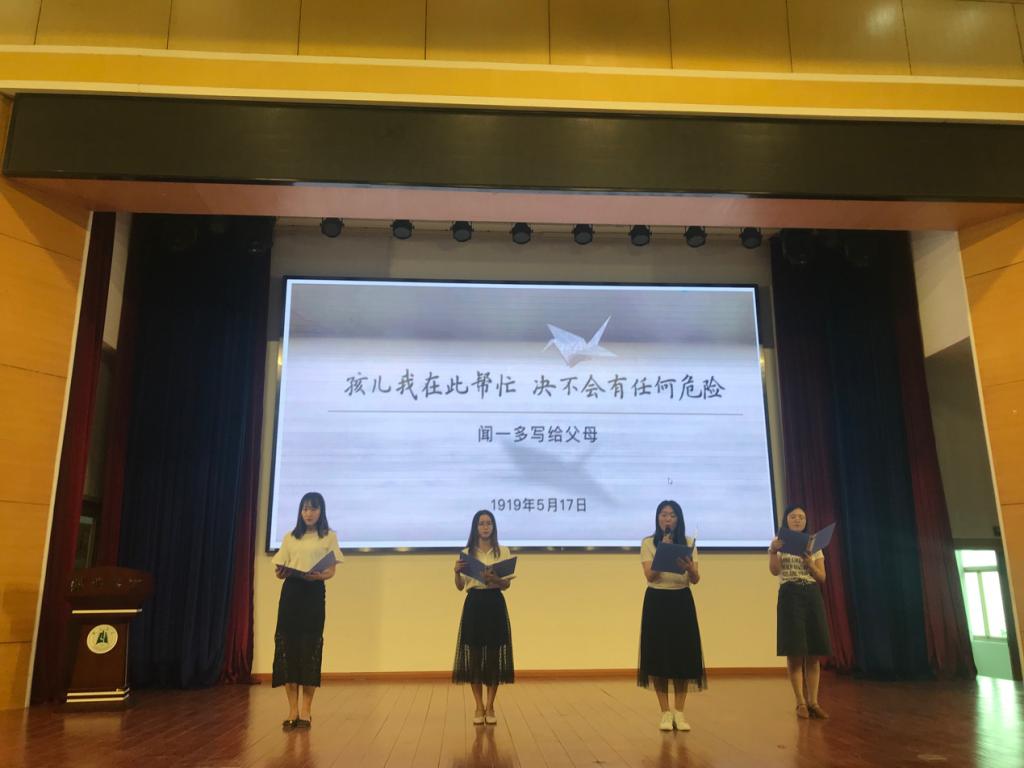 各年级共9组参赛队伍先后登场,他们以诵读、讲述、视频等形式,深情朗诵《愿润之革命早日成功》、《陈觉:如今之死则重于泰山》、《焦裕禄子女写给天堂父亲的一封信》、《李大钊:谋中国民族之解放》、《闻一多给父母的信》等一封封红色家书,带领大家一同重温历史的温度,感受信仰的坚定力量,用饱满的情绪、深情的话语纪念百年前的那场伟大运动,表达当代青年忠于祖国、不负重托的壮志豪情。这些家书被同学们演绎的文情并茂、感人至深。有长辈致子女者,殷殷嘱咐,谆谆叮咛,那种期望之情令人动容;有子弟致长辈者,孺慕怀念,婉转问切,亲情孝思,跃然纸上;更有夫妻鱼雁往返,卿卿我我,凄恻婉转,读来感人肺腑;有身在战地者,向家人长辈深切表达,忧国忧民,誓志报国,慷慨激昂,读来令人热血沸腾。